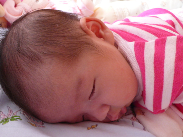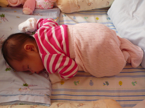 為了求頭型好看,開始訓練Amber趴睡,一開始很怕她悶著,所以陪睡在旁邊觀察,結果小妮子果然是頭好壯壯型的,居然頭會仰起來換方向趴睡,這麼一來就讓我放心許多。不過小妮子還是跟爸比一樣喜歡大呼呼地正睡,要等熟睡後才可以幫她換趴睡姿勢,她也跟其他寶寶一樣,趴睡時屁屁總是蹶得老高的,看起來還有點像無尾熊啊!