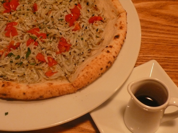 店內有自己的爐窯,一位個頭不高,年紀輕輕的女生很快速地做著披薩皮,熟練地鋪上食材,快速地送進窯內,一會兒,披薩就熱騰騰端上。而我們風塵僕僕地抵達京都的第一個夜晚,就是衝著這塊小魚披薩而來。