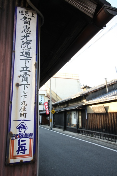 到京都旅行時,應該會經常看到翹鬍子仁丹的蹤影吧,這個叫做仁丹の町名表示板,大約是1910年開始,這種結合地址告示的廣告牌是森下仁丹公司的行銷手法,因為當時日本各地幾乎沒有所謂的門牌告示之類的東西,常讓外地人找不到路,為了奉行該公司的透過廣告來達成薰化益世的使命,仁丹公司在各大城市的電線桿、牆壁開始掛上町名表示板,不但讓人找到了想要去的町,也成功地將翹鬍子仁丹行銷出去。