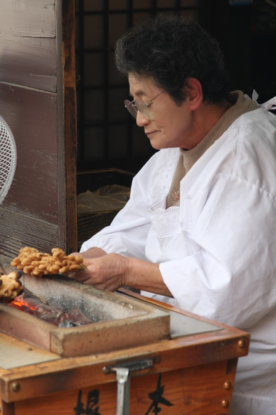 步出門外,見到老婆婆仍專注的烤著あぶり餅,心想:「真幸福,能吃到老婆婆烤的あぶり餅啊!」