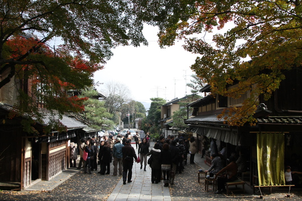 兩家店分別開在對面,常年都是以碳火烤著一串串黃豆粉製的あぶり餅。走在坂道間,看著兩家暖簾隨風飄逸,一陣陣碳火香與煙鳥裊盤繞於間,有種好像置身在古裝劇拍攝現場般,あぶり餅似乎有股可以把時光停留在遙遠的幾百年前的魔力。
