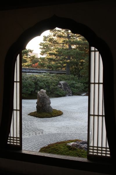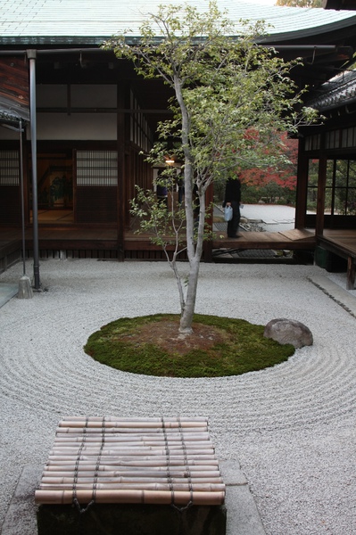 晚秋的建仁寺,本坊中庭的「潮音庭」靜靜地吐露著秋的蕭瑟,與三尊石對望,幾株紅葉,在天色漸暗的向晚中,仍然優雅地朝天際伸展。建仁寺是京都最古の禅寺,在潮音庭感受到古寺的優雅莊嚴。