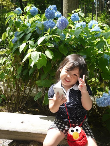 大太陽下,有紫陽花相櫬,孩子的笑容無限美好。(Amber:媽媽其實我是因為拿到你的哀鳳手機在高興啦~)