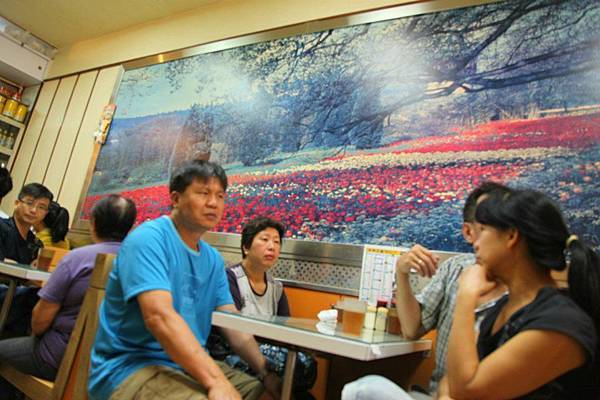 十點多,茶餐廳坐滿了當地居民,牆壁貼了老式的風景壁紙,讓我想起以前小時候家裡的客廳也貼了這樣的壁紙。