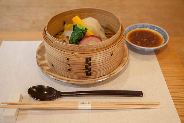 中式蒸籠擺上極為精緻的野菜及海老燒賣。