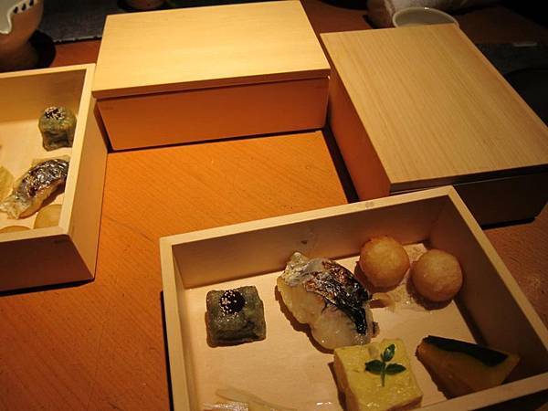 木盒裡裝著前菜。鰆魚の西京焼、生麩田楽、京の出汁巻き玉子都表現可圈可點。