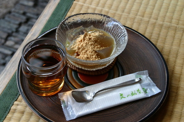 除了宇治金時之外還點了寒天,這個甜品吃起來很像我們小時候常吃的涼洋菜凍,上面還撒上黃豆粉配上焙煎茶,真是爽口。京都的夏天相當酷暑,吃上一口寒天,可真是涼快得意啊!